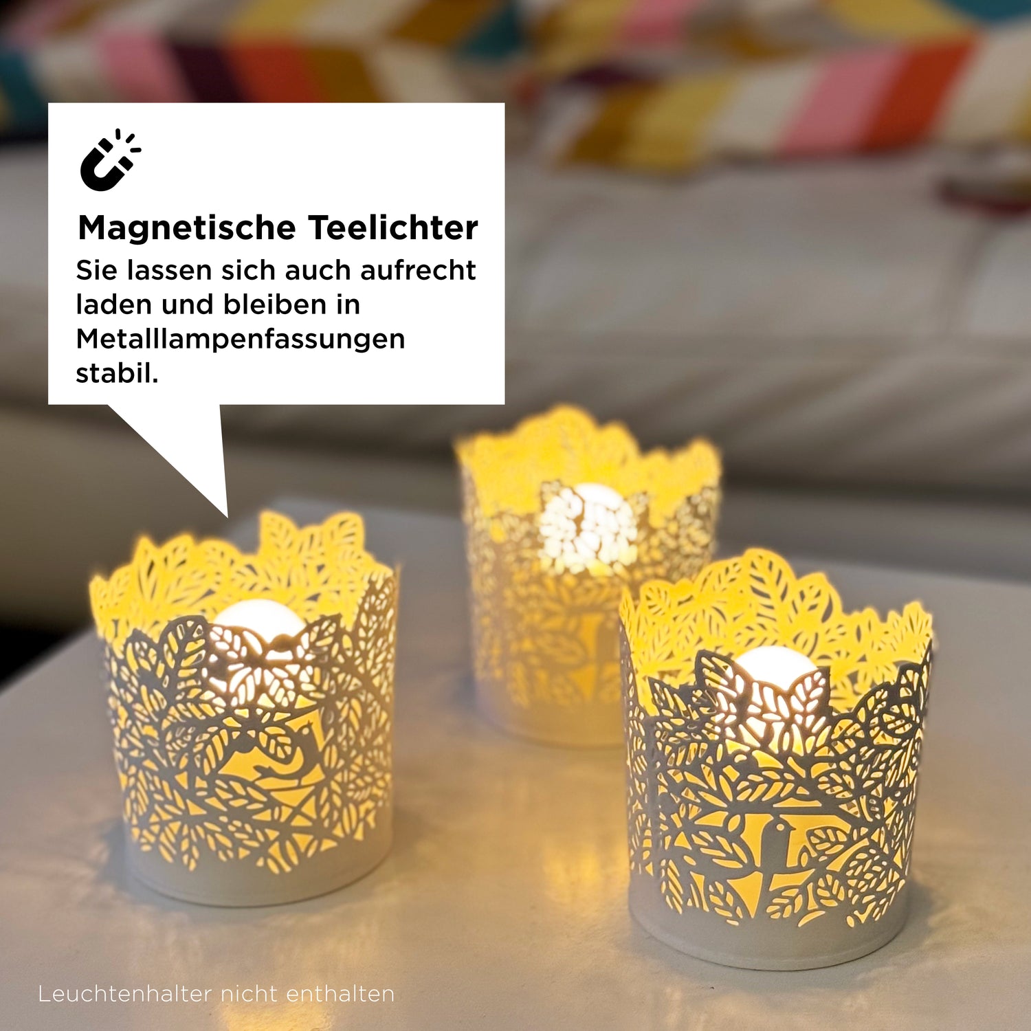 Du kannst die Teelichter in deinen Lieblingslampenfassungen verwenden. Dank ihres magnetischen Sockels eignen sie sich besonders gut für Metallfassungen: Sie bleiben fest an ihrem Platz und bewegen sich nicht, auch wenn du sie aufstellst.