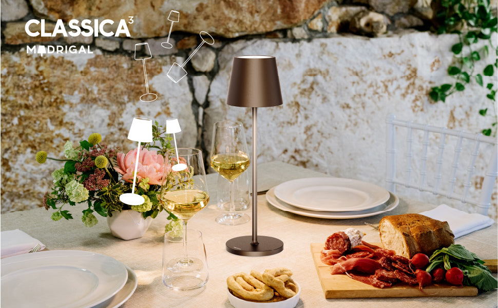 Classica è una lampada da tavolo ricaricabile studiata per aggiungere un’atmosfera magica alle tue cene. La sua statura di 38 cm la rende ideale per illuminare con perfezione la tavola, creando un'atmosfera accogliente. Classica 3 ha una nuova elegante base rotonda ed offre la libertà di sostituire autonomamente le batterie ricaricabili.
